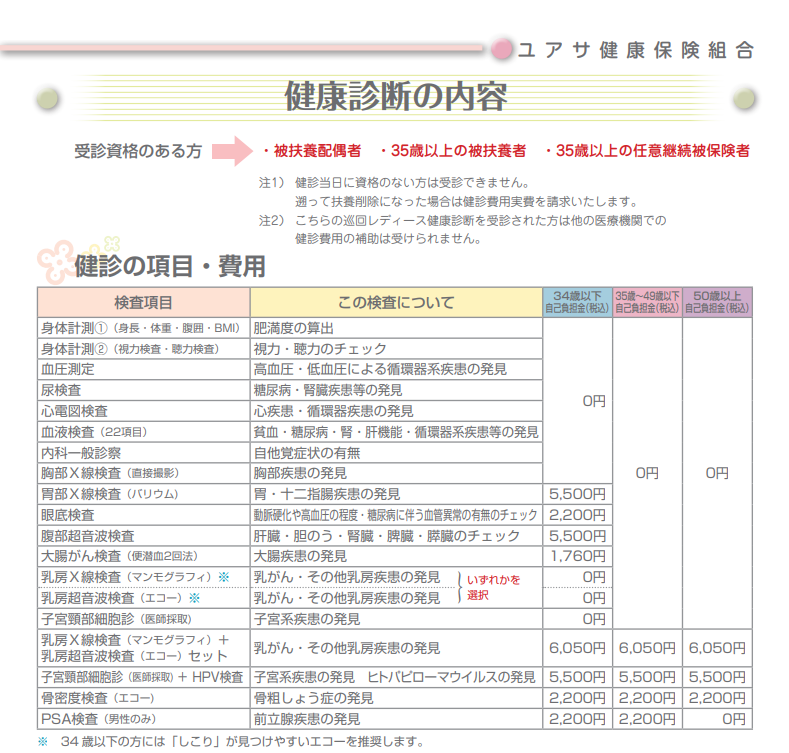 ・健保補助額:8,000円を上限とする実費 但し、家族健診(巡回レディース健診)を受診する場合は健診項目に含まれるため補助無し。 ・補助金申請方法:被保険者は事業所経由、被扶養者は直接健保へ申請 |